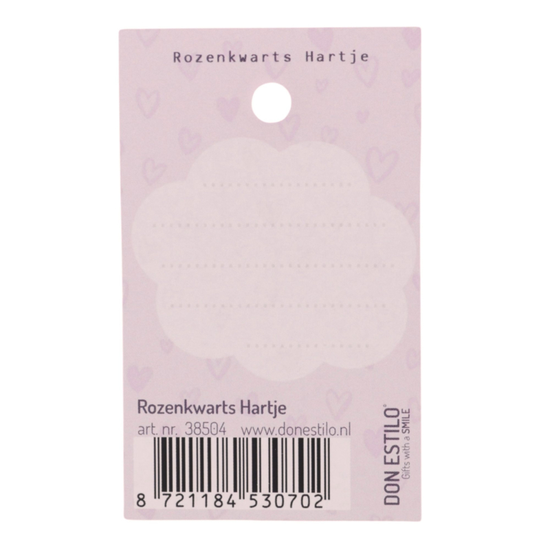 Rozenkwarts hartje “Heel veel liefde” op een Roze Kaart (9×5,5cm)