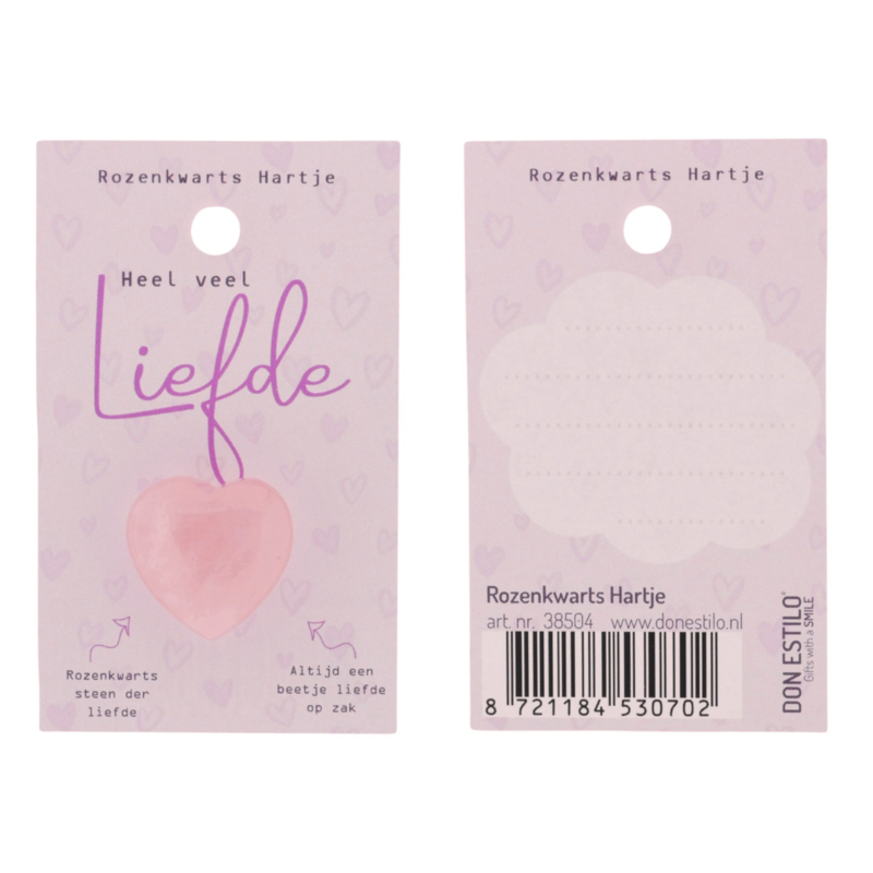 OverzichtRozenkwarts hartje “Heel veel liefde” op een Roze Kaart (9×5,5cm)