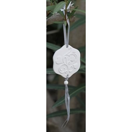 Een geparfumeerde bloem van gips in een zakje van organza. De bloem is geparfumeerd in de geur lavendel.