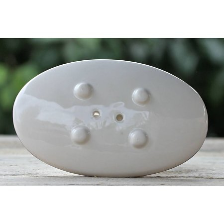 OverzichtEen ovaal zeepbakje van aardewerk. De kleur is gebroken wit met een lila randje. Het zeepbakje staat op 4 ronde pootjes.