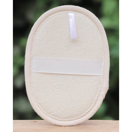 De loofah disk heeft een elastieke band aan de achterzijde.